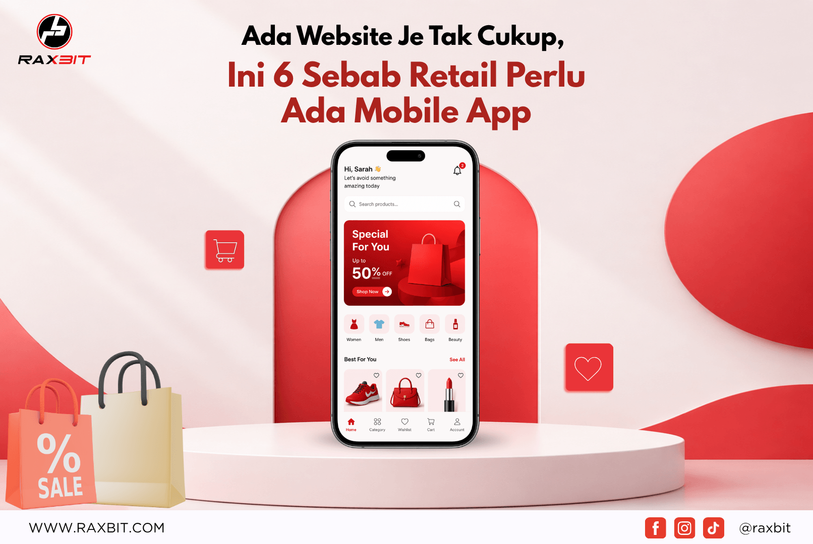 Dengan Mobile App dari RAXBIT, kita boleh bina platform sendiri untuk tarik customer, hantar promo, dan tingkatkan conversion, semua dalam satu sistem.